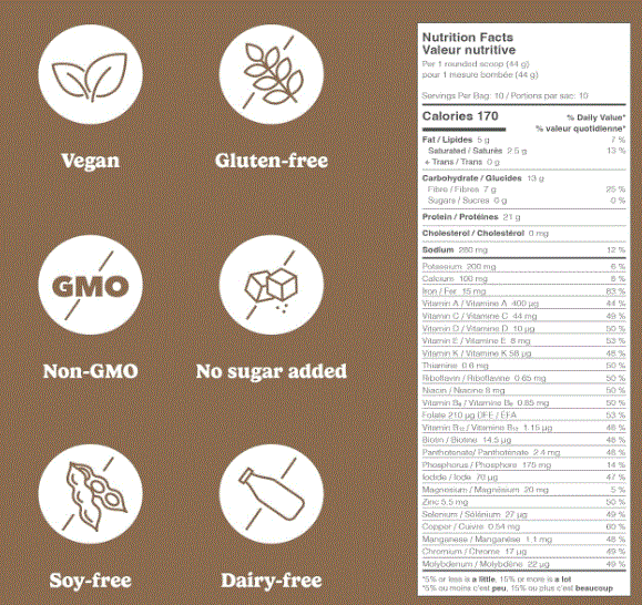 Protein blend (pea protein, milled golden flaxseed), Natural flavours, Soluble tapioca fibers, Coconut milk powder* (coconut milk powder*, tapioca maltodextrin*, acacia gum*), Alkalyzed cocoa powder, Acacia gum, Guar gum, Xanthan gum, Medium chain triglycerides (medium chain triglycerides from coconut oil, acacia gum), Fruits, vegetables and mushrooms blend (broccoli, spinach, kale, pumpkin, sweet potato, sunflower seed, cranberry, chlorella, maitake mushroom, shiitake mushroom, pomegranate juice powder*, acai juice powder*, goji juice powder*, grape juice powder*, amla fruit powder*, aronia powder*, sea buckthorn juice powder*, camu camu powder*, acerola juice powder*), Rebaudioside M, Salt, Bacterial culture and enzymes blend (rice maltodextrin, Bacillus subtilis, amylase, protease). *Organic ingredients May contain: soybeans, eggs, peanuts, tree nuts, sesame, and fish. Produced in a facility that also processes wheat and milk. Good Protein follows strict allergen management protocols in all of our manufacturing facilities