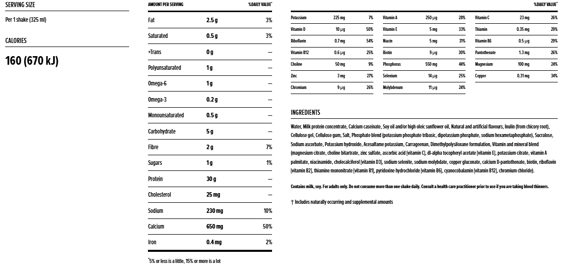 water, milk protein concentrate, calcium caseinate, whey protein concentrate, high oleic sunflower oil, inulin (from chicory root), salt, natural and artificial flavours, cellulose gel, cellulose gum, tripotassium phosphate, dipotassium phosphate, sodium hexametaphosphate, DATEM, carrageenan, sucralose (45 mg per 325 ml serving), acesulfame-potassium (45 mg per 325 ml serving), potassium hydroxide, vitamins and minerals (sodium ascorbate [vitamin C], DL-alpha tocopheryl acetate [vitamin E], zinc amino acid chelate, biotin, vitamin A palmitate, niacinamide, potassium iodide, copper amino acid chelate, calcium D pantothenate, chromium chloride, cyanocobalamin [vitamin B12], phytonadione [vitamin K], sodium molybdate, sodium selenite, folic acid, cholecalciferol [vitamin D3], pyridoxine hydrochloride [vitamin B6], thiamine mononitrate [vitamin B1], riboflavin [vitamin B2], magnesium phosphate, ferric orthophosphate, manganese sulfate). Contains milk